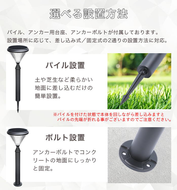 用途に合わせて付属パーツで「パイル設置」と「ボルト設置」が可能です。