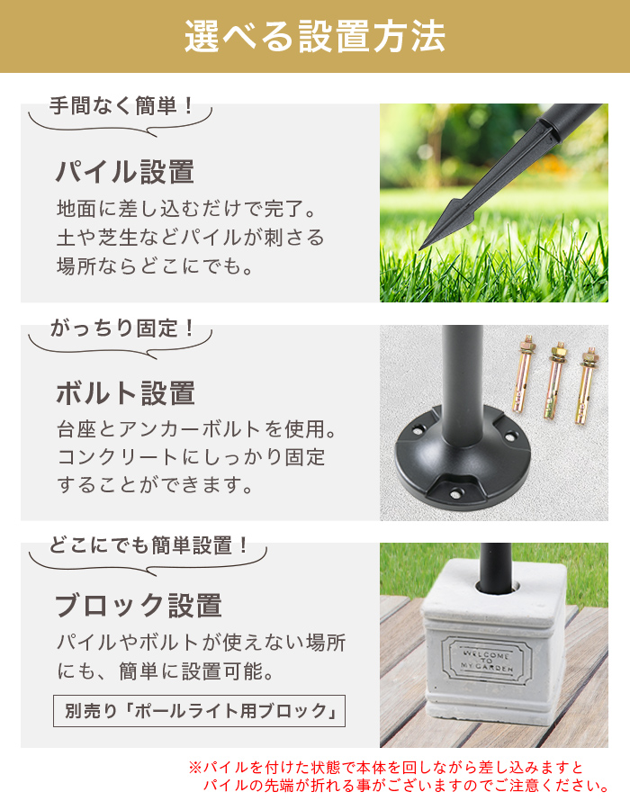 内容物 ランプ本体 / ポール3本 / パイル / ジョイント2個 / ボルト設置用台座 / アンカーボルト3本