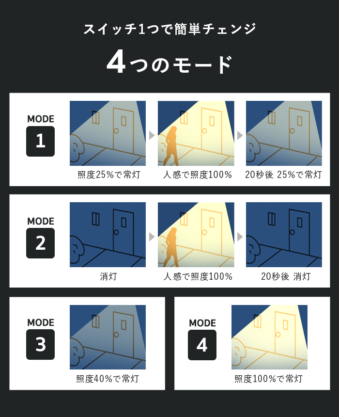 - 消灯からセンサーで強点灯 ※約20秒